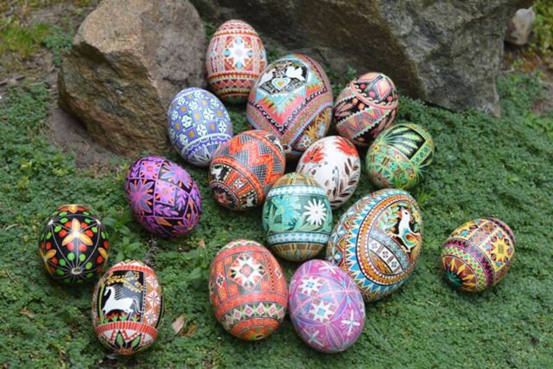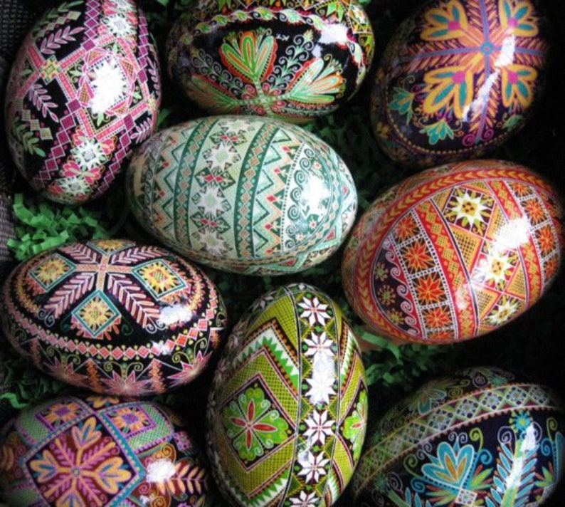 Using a strip of paper, measure the longitude of the egg (around lengthwise). Drill a hole in the bottom of the egg using a small drill. The process of wax etching is similar to batik, with a stylus being used to apply the melted beeswax to the eggshell. Who is the leading manufacturer of pysanky easter eggs?